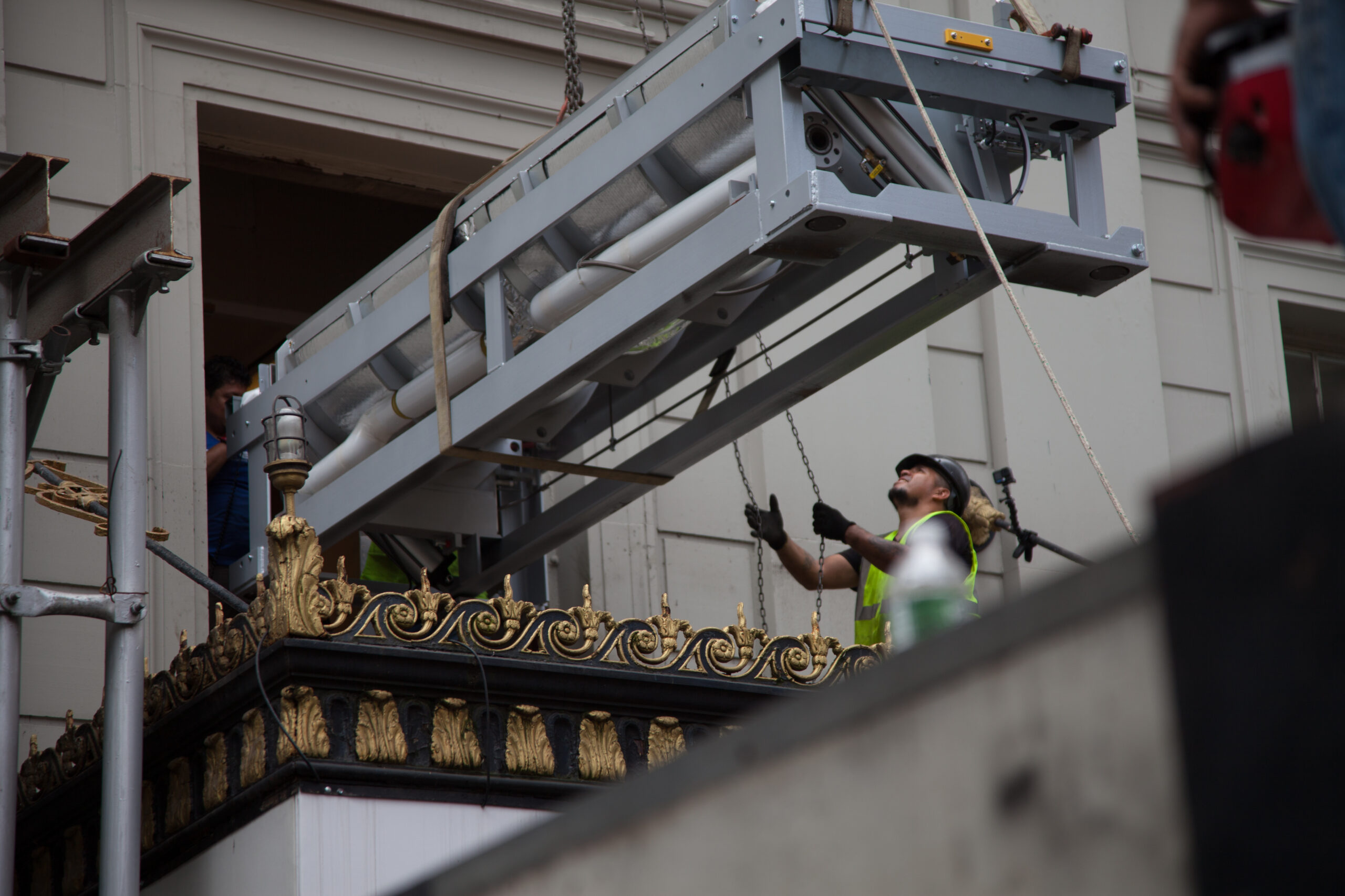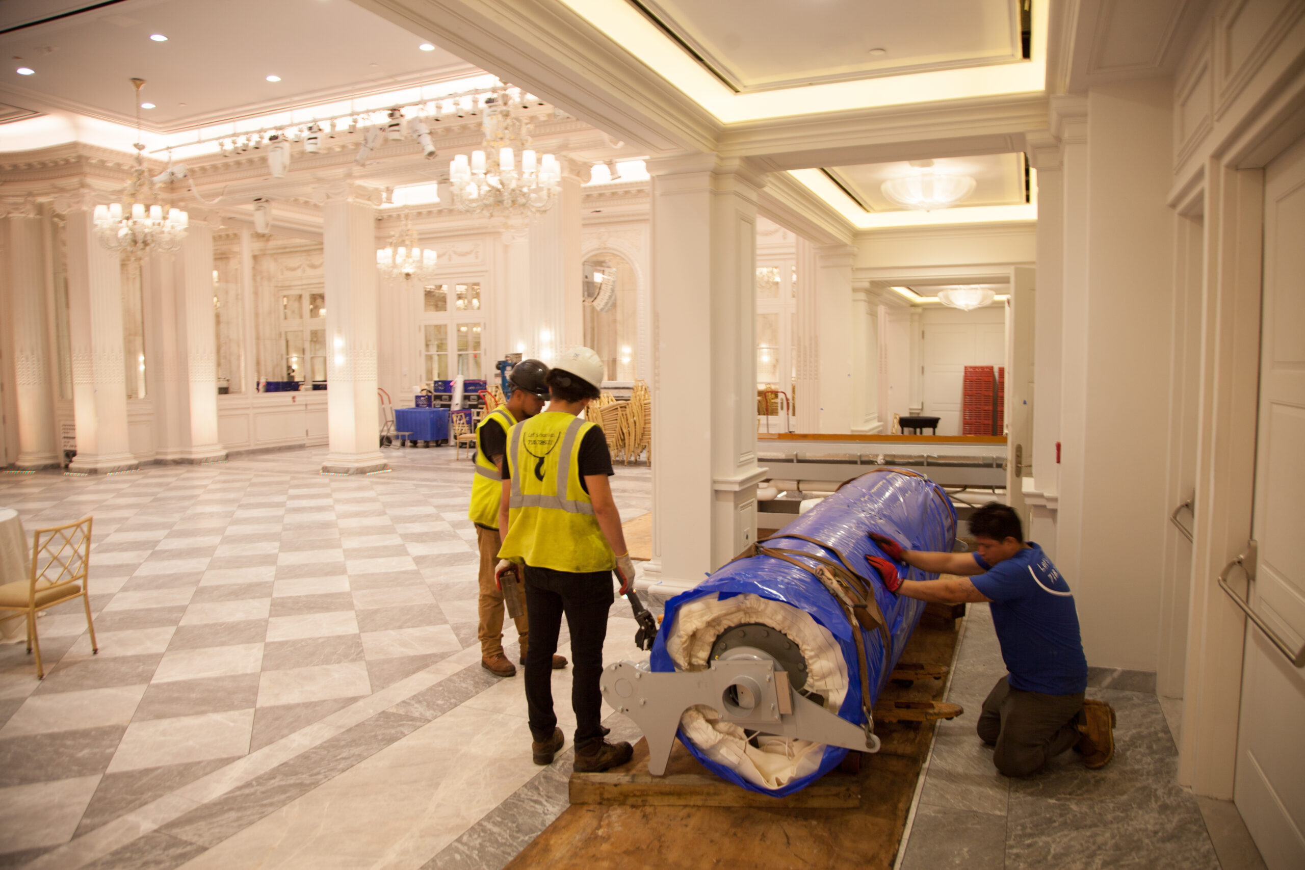 Each machine was broken down into sub-3,000-pound sections — the largest of which had to be craned through a fragile second-story historic window. From there, the pieces were rolled carefully across a protected marble ballroom floor and guided through narrow back hallways. Finally, the equipment was lowered down an elevator shaft using a custom-installed I-beam for controlled vertical rigging – a process requiring coordination with a third-party elevator company and inch-perfect execution.